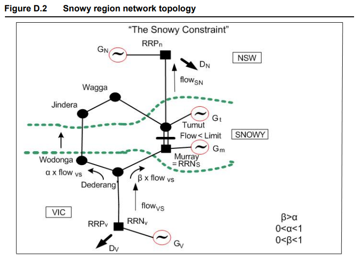 From the rule change docs, there appears to be a lot of scenarios where constraints inside the Snowy Region (between Tumut and Murray below) would incentivise the Snowy generators to curtail themselves.